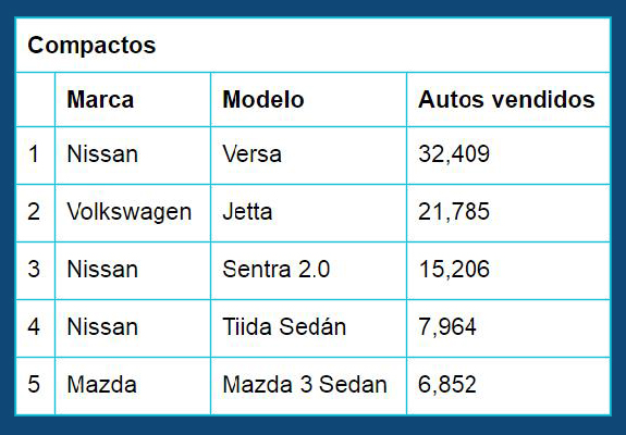 Mientras tanto, los tres autos más vendidos en México, de enero a mayo de 2016, son el Nissan Versa, del cual se han venido 32,409 unidades, seguida por Volkswagen Vento con 24,231 y en tercer lugar está el Chevrolet Aveo con 23,290 vehículos vendidos.