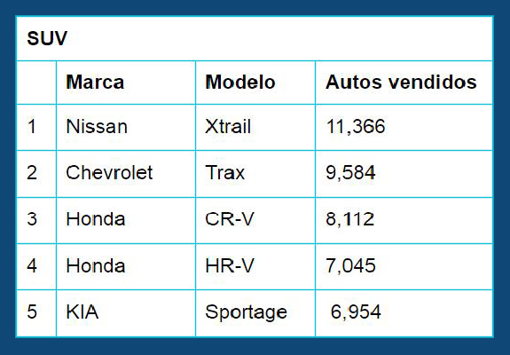 Por sector, el auto subcompacto preferido por los mexicanos es el Volkswagen Vento, mientras en compactos el predilecto es el Nissan Versa; mientras la SUV más vendida en México es la Nissan Xtrail.